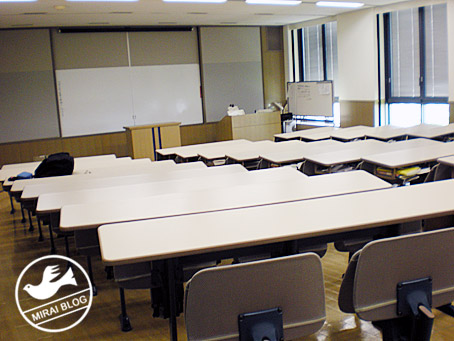 教室は階段教室。ちょっと暗いですが、ほとんどの授業でパワーポイントを使うため、基本的にいつもシャッターは降りています。